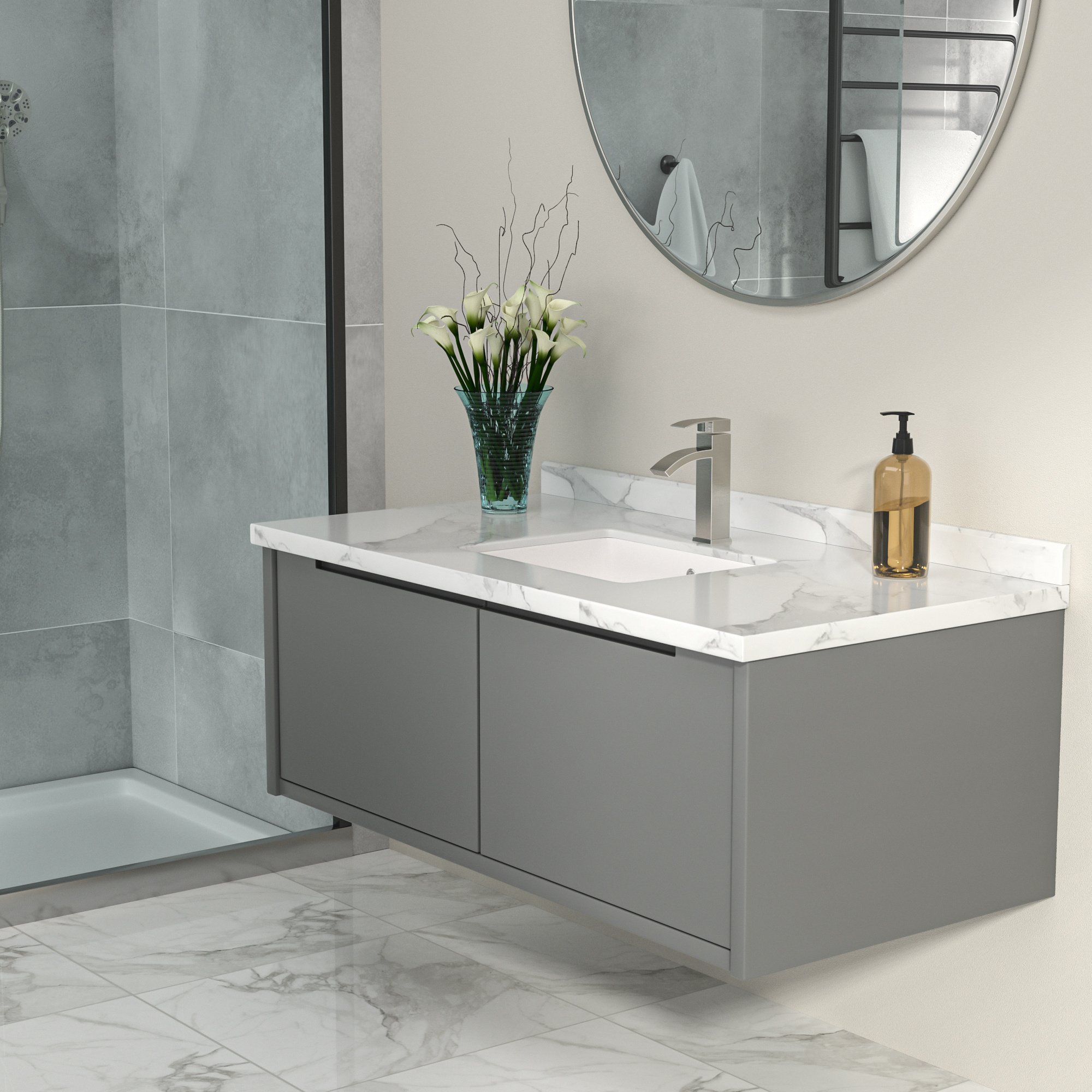 1.Classic modern shape creates timeless design in a guest bath, master bath or powder room.