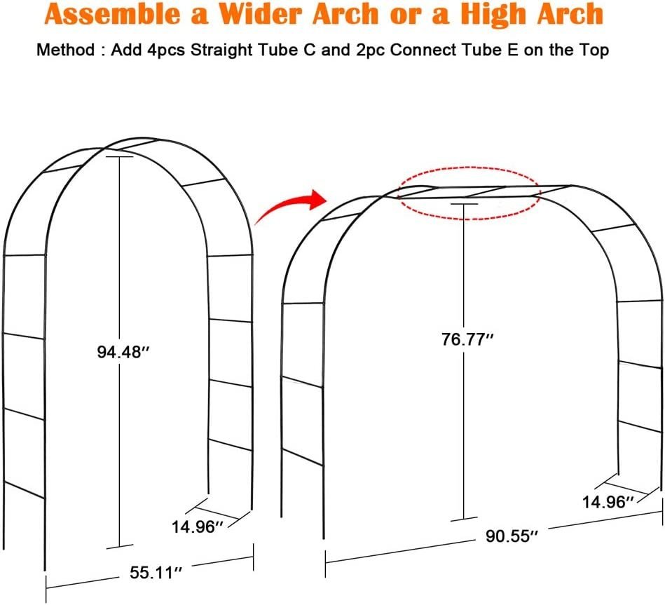 1.One or Multiple Arches: This garden arch is Dark Green, can use to a wider arch(7.5 feet Wide * 6.4 Feet High ) or a high arch (4.6 Feet Wide*7.9 Feet High) by using connection tubes.