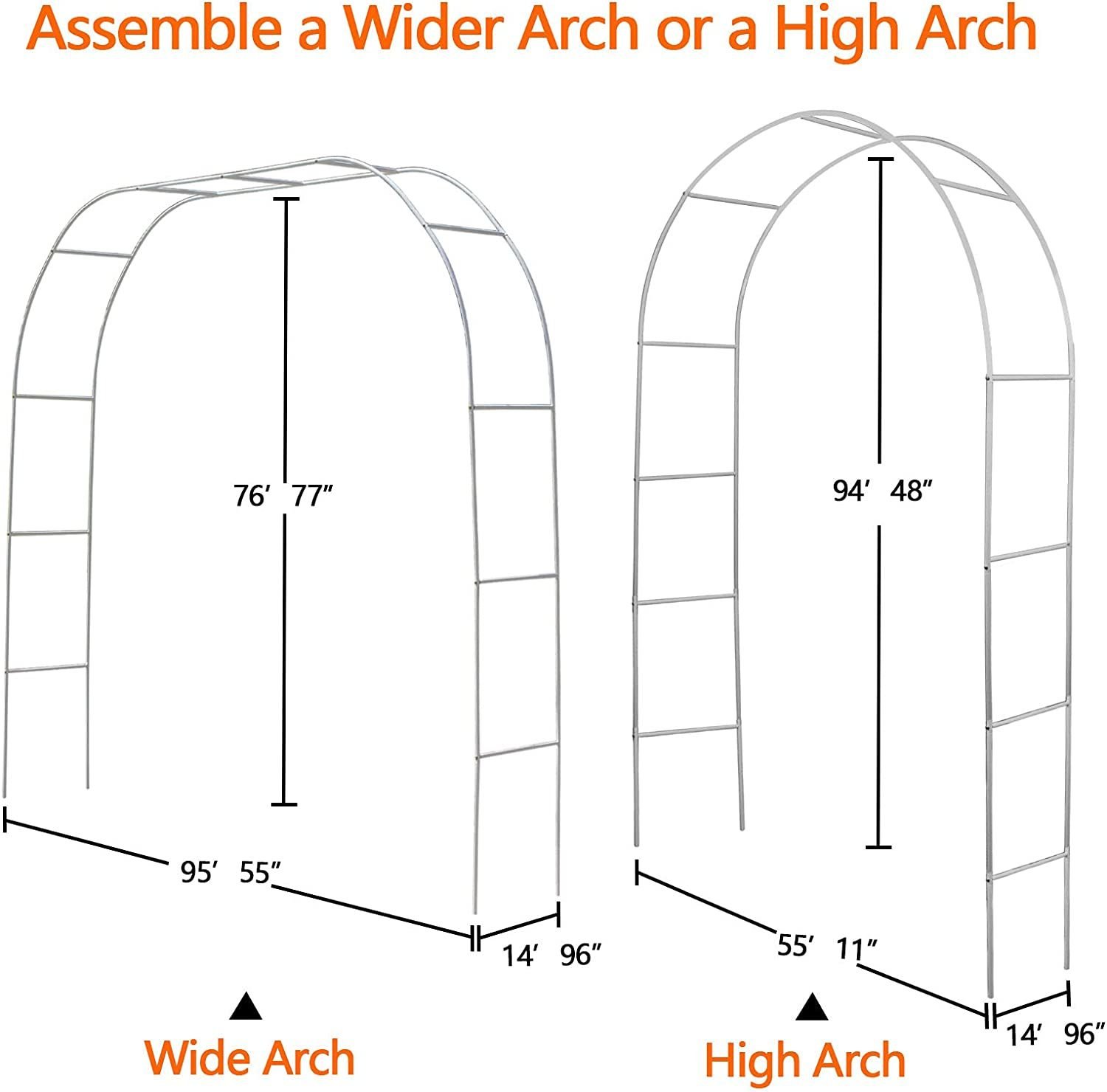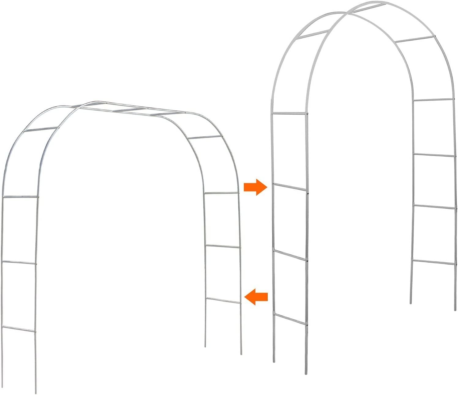 1.One or Multiple Arches: This garden arch is Dark Green, can use to a wider arch(7.5 feet Wide * 6.4 Feet High ) or a high arch (4.6 Feet Wide*7.9 Feet High) by using connection tubes.