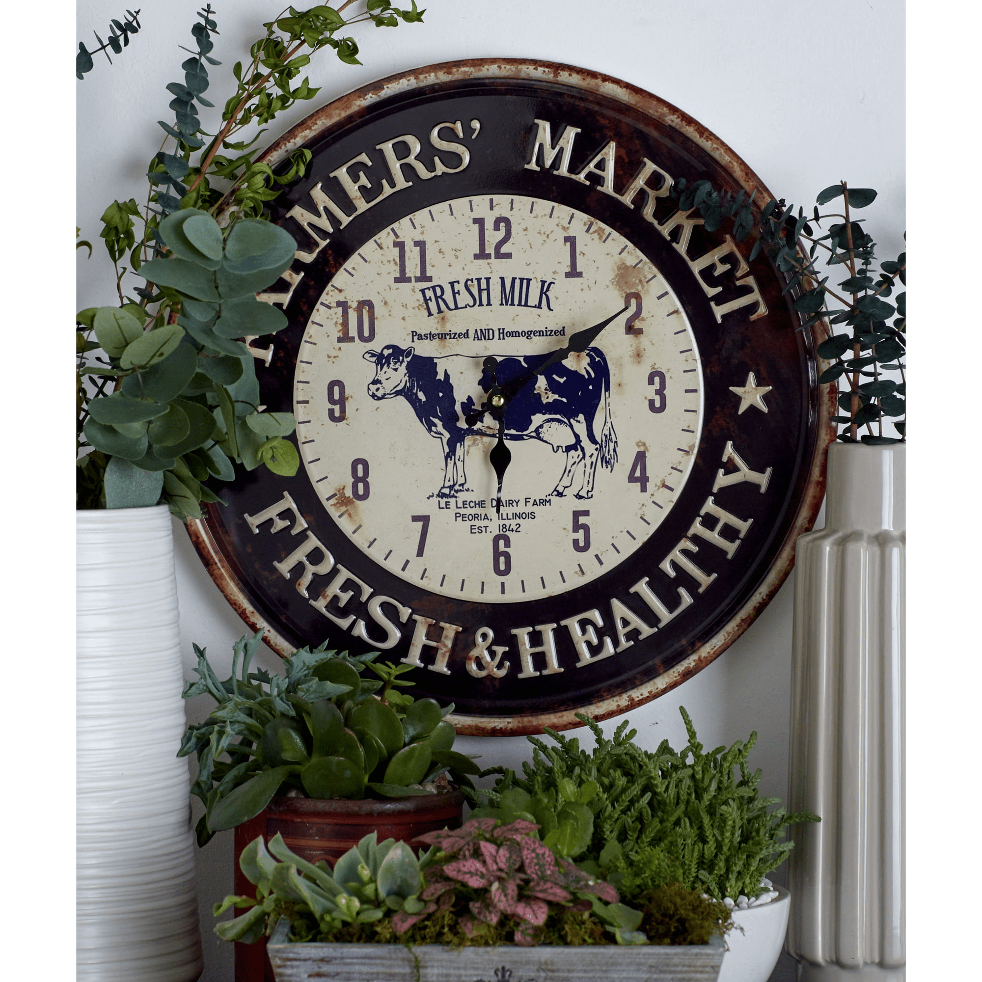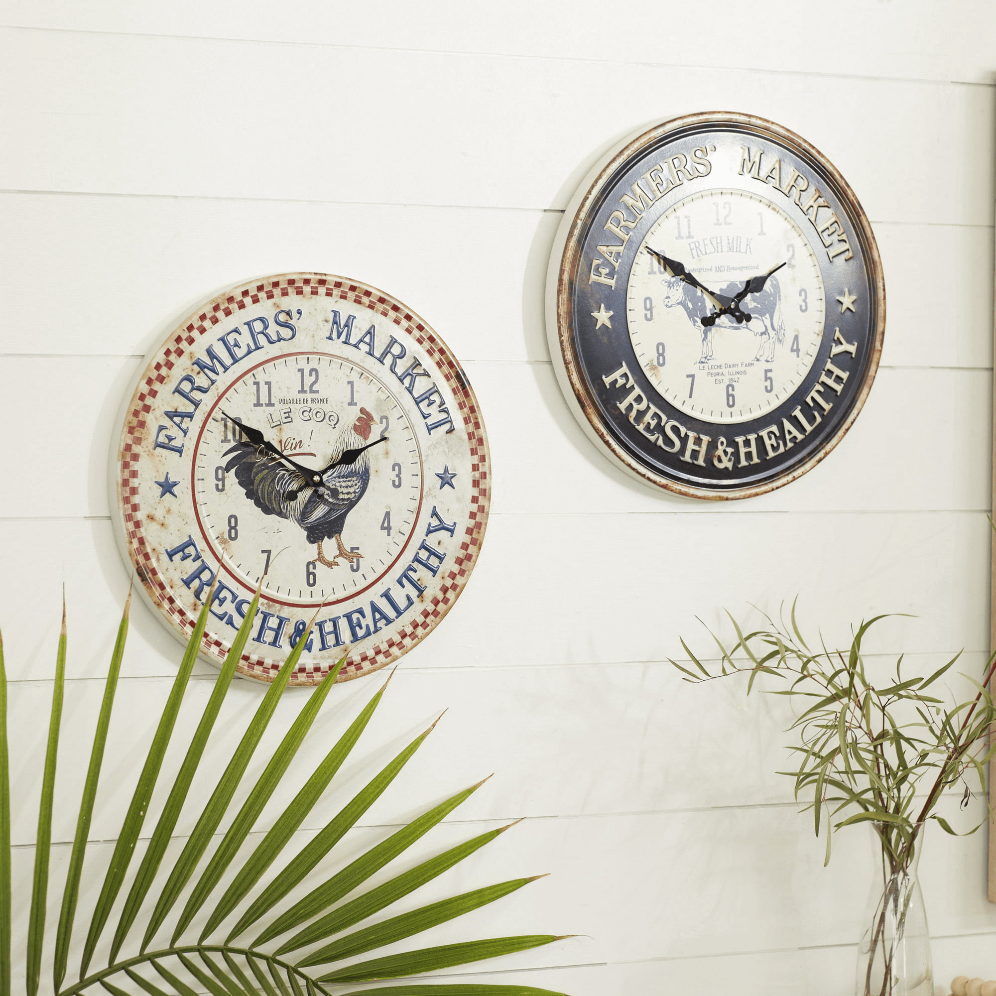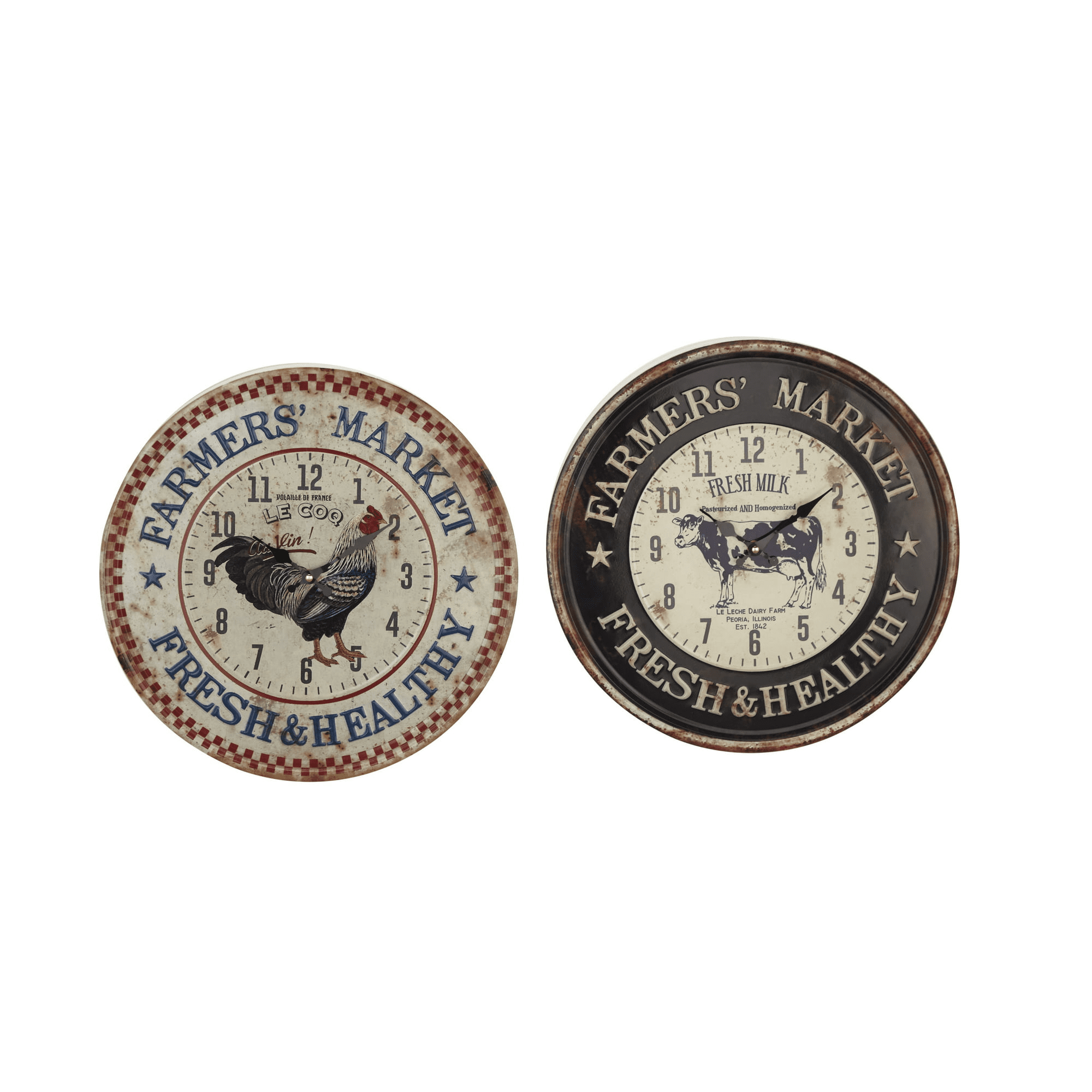 Decmode 16"D black metal rooster wall clock (2 count) is a unique addition to your stylish home. Bring functionality and style into your home with a statement wall clock to maximize any open wall space. Take control of your day and keep track of time with this classic designed wall clock with a glamorous flare. Designed with a farmhouse style for that homey feeling. Requires 1 aa battery each. Batteries not included. This item ships in 1 carton. Clock face features arabic numbers.. The clock mechanism runs silent. Can be hung vertically using the keyholes on the back; nails and screws not included. Suitable for indoor use only. This item ships fully assembled in one piece. This black colored kitchen clock comes as a set of 2. Farmhouse style. Clock face reads "Farmer's market fresh & healthy" in blue lettering around the clock face. The cow clock has dark brown and creme colors, also wit "Farmer's market fresh & healthy" with stars around the clock face..