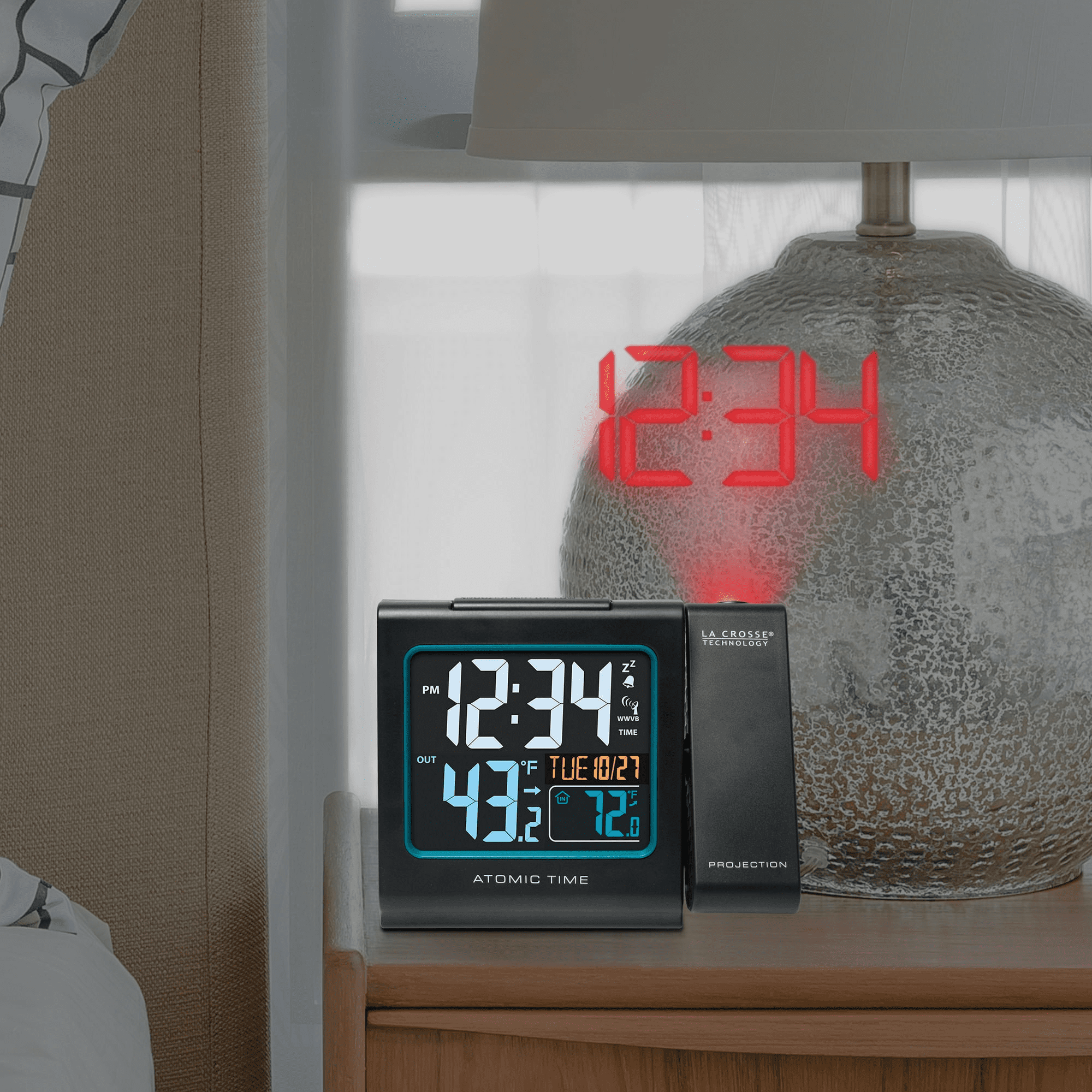 Projects time and/or outdoor temperature on the wall or ceiling in easy to read numbers
