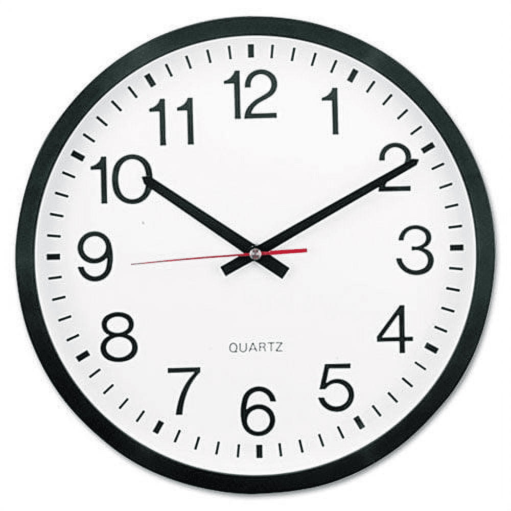 Universal wall clock is a battery operated quartz analog clock with large face and classic bold styling.