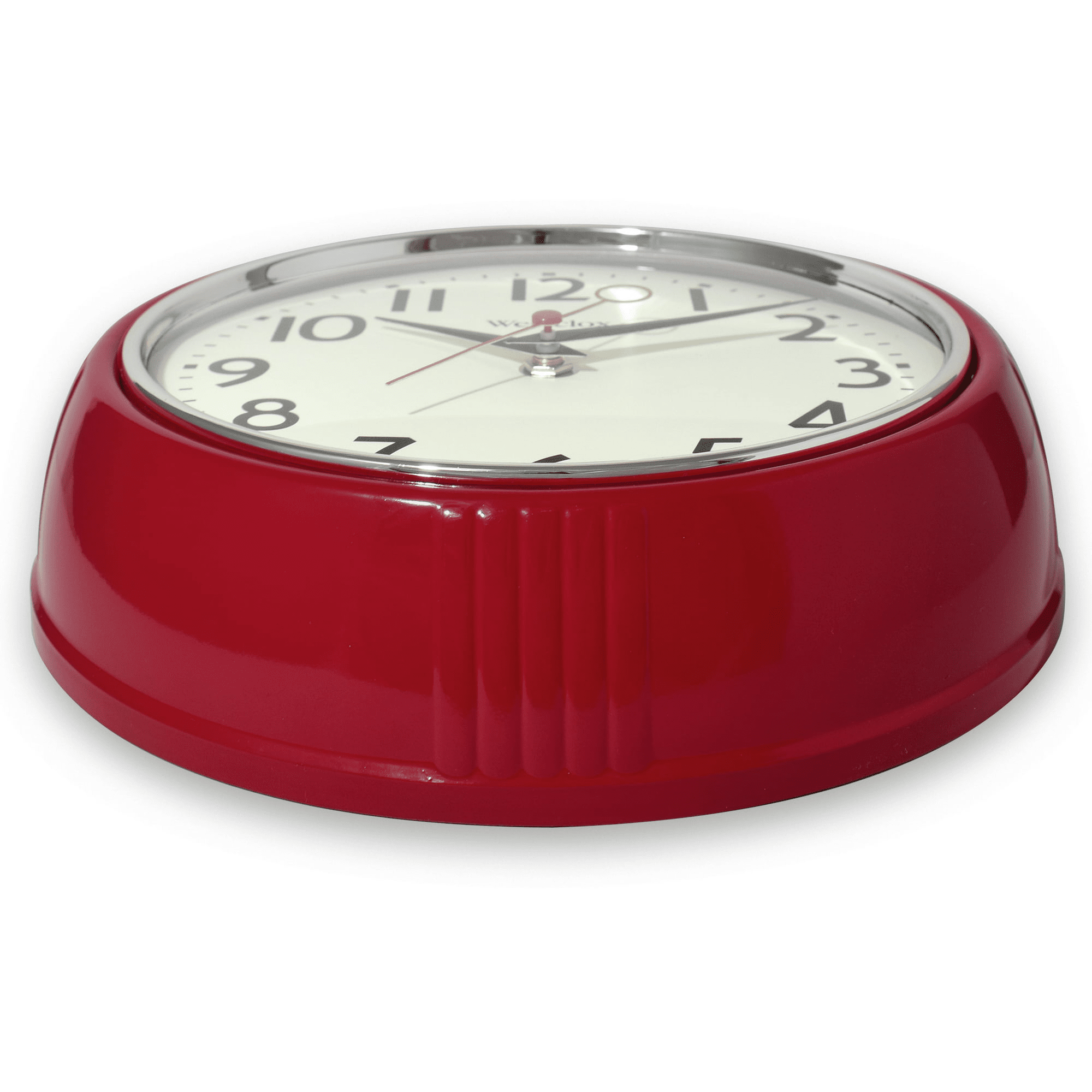 Beautifully crafted west lox 9.5' kitchen retro wall clock features a deep 2' frame with raised retro details. Beautiful high gloss red retro finish with a chrome mirror finish trim bezel. The clean easy to read dial with detailed red seconds hand make this a functional and attractive classic timepiece. Great for kitchens! Quality quartz movement ensures perfect time accuracy. Requires one aa battery to operate. Proudly made by west lox, trusted by americans since 1884.