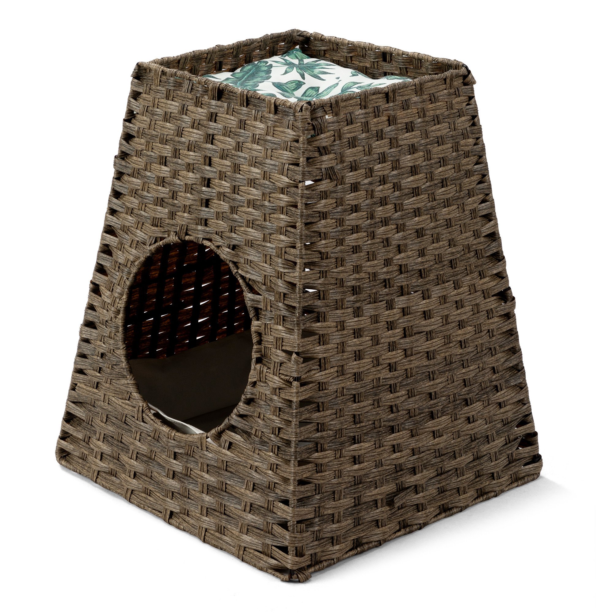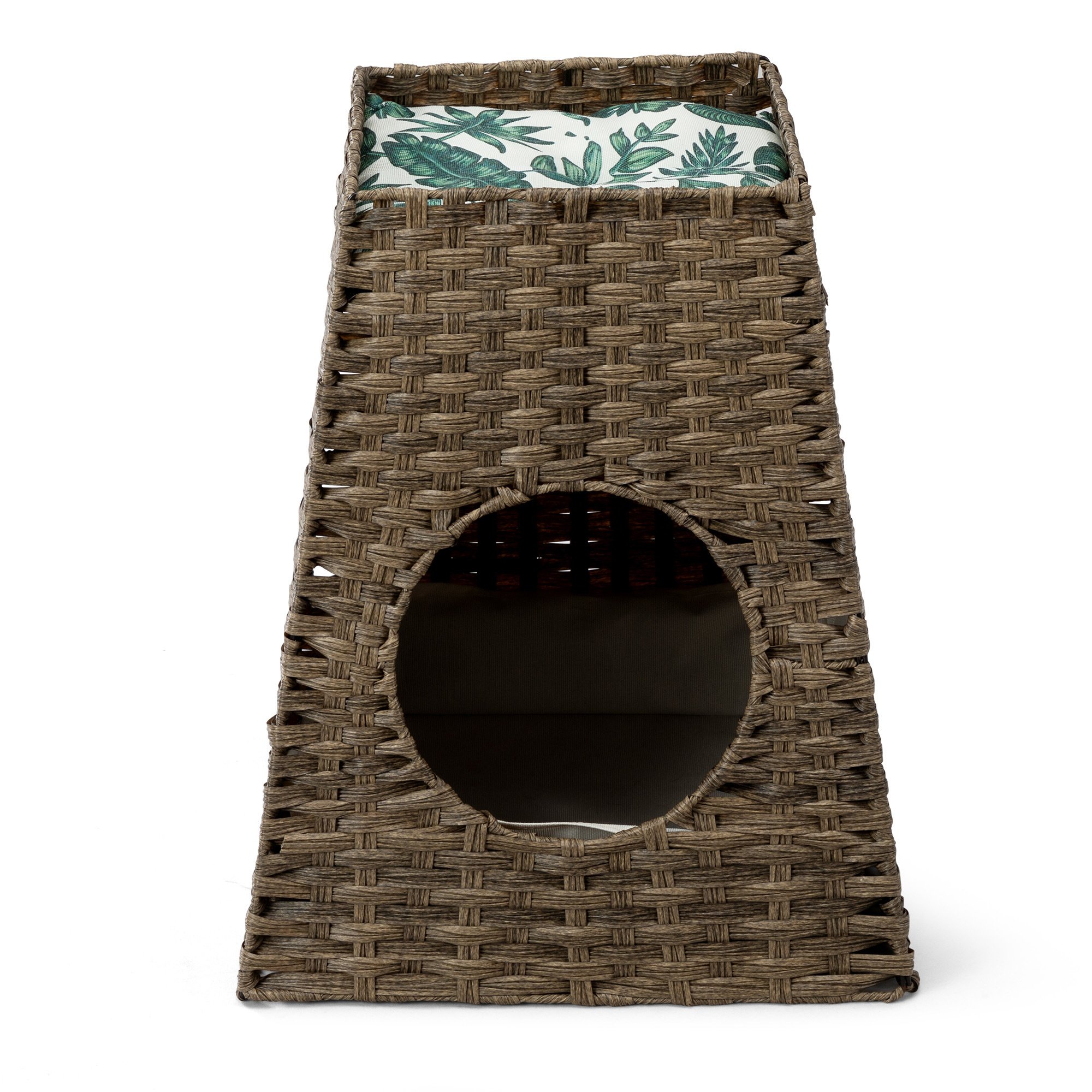 Bullet Points: [Multipurpose Cat Furniture]: This versatile cat litter box enclosure is designed to accommodate a variety of litter boxes, doubling as a nightstand, side table, or discreet storage unit. A soft cotton linen mat and an ample top surface, perfect for placing pet's toys.[Remarkable Stability]: This rattan cat house is easy to move due to its lightweight design and can support the weight of cats up to 9 pounds. Crafted with a robust yet lightweight material, it promises durability and dependability, creating a secure and cozy haven.[Distinctive and Modular Design]:The cat washroom streamlines the cleaning process. For effortless litter disposal, simply detach the litter box's base and outer frame, then grasp the litter bag's handle to conveniently transfer and dispose of any stray litter.[Distinctive Rattan Construction]: This covered rattan cat litter box allows for ample sunlight penetration, creating a cozy spot for your cats. With a considerate ventilation system, it enhances the cleanliness of the enclosed litter area, maintaining an odor-free environment.[Hassle-Free Experience]: This hidden kitty litter furniture can be set up swiftly without the need for any screws; simply unfold it to have it ready for use instantly. This ensures that your kittens can promptly enjoy a tidy and comfortable toilet space. Specifications:Color: Dark BrownMaterial: PE + Iron WireOverall Dimensions: 18.11"L x 18.11"W x 22.05"H Inner Box Size: 16.14"L x 16.14"W x 3.94"HTop Space Dimensions: 11.81"L x 11.81"W x 3.94"HCat Hole Diameter: 9.84"Cotton Linen Cushion Size: 11.81"L x 11.81"WWeight Capacity: 8.82 lbsNet Weight: 4.96 lbs